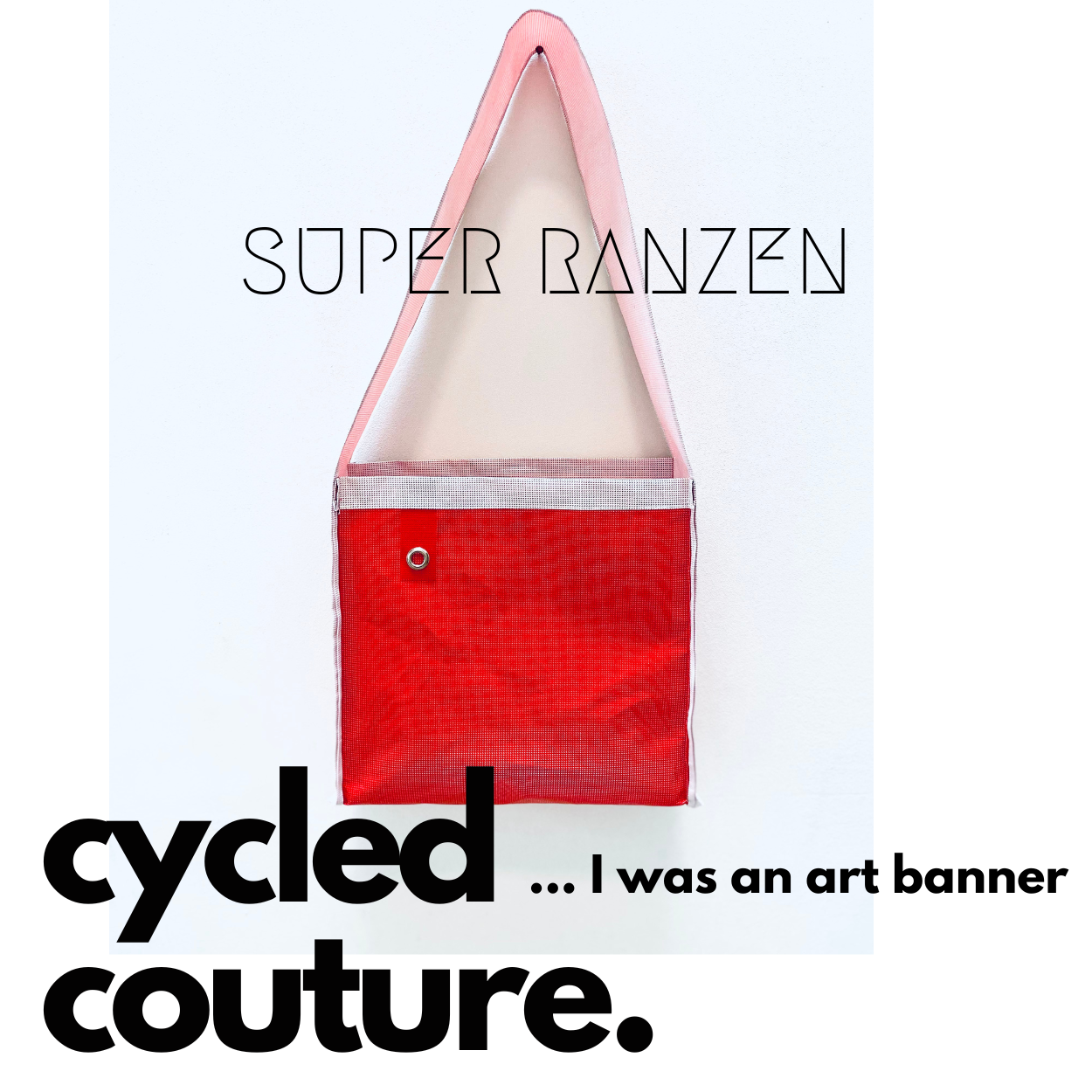 Aus einem rot-weißen Kunstbanner re-designed ist die Tasche einzigartig, mit oder ohne Aufdruck. Die urbane Tasche ist two-tone reversibel und kann in weiß oder rot gtragen werden. Besonders schön ist der changierende Farbeffekt, da durch den Netzstoff die Innenfarbe durchscheint.