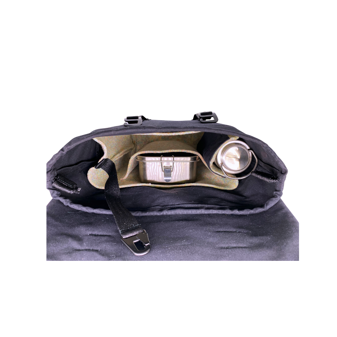 Stabiles wasserabweisendes Outdoormaterial 100% Baumwolle. Die herausnehmbare Innentasche aus 100 % Recyceltem Polyester R-PET Filz wirkt klimaregulierend. Entspanntes Tragen mit den gepolsterten Schulterriemen in 4 cm Breite. Stufenlos verstellbar Schultergurte für alle Körpergrößen. Ergänzbar mit dem Brustgurt in schwarz.